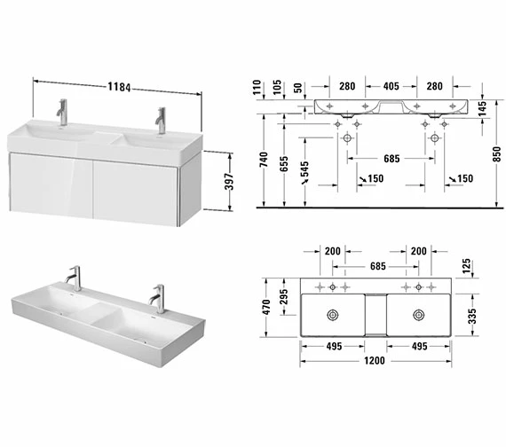 Duravit XSquare 1184mm wall Mounted 2 Pull-Out Compartment Vanity Unit is a modern-day product for compact bathrooms. Suitable for wall-hung installation, it is designed by Kurt Merki Jr.and is a stylish and versatile unit that can be used with your choice of compatible mixer taps available separately. Complete with 2 Pull-Out Compartments, this product is easily opened and closed and has high quality engineered wood construction. Supplied rigid for fast and easy installation, this model is suitable for placement within a traditional or modern style of bathroom design.