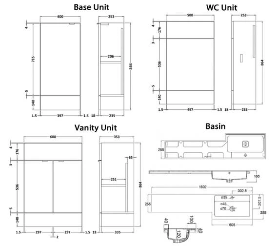 - The product consists of Vanity Unit, Base Unit, WC Unit, Plinth and Basin.