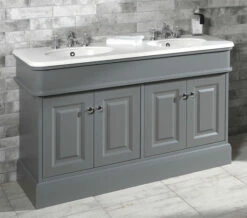 Make the most use out of your space as you can with the Silverdale Victorian 1400mm Painted Grey Cabinet with Worktop and Basin. This vanity unit comes in a handsome grey finish that can complement the traditional design of the vanity. It features a double under-mount cabinet with four doors with the solid surface worktop sitting on top. It is sturdy and strong, having an MDF construction ideally suited for wet areas. The 2 bowl basin is suited for under-mount installation and is finished in white.